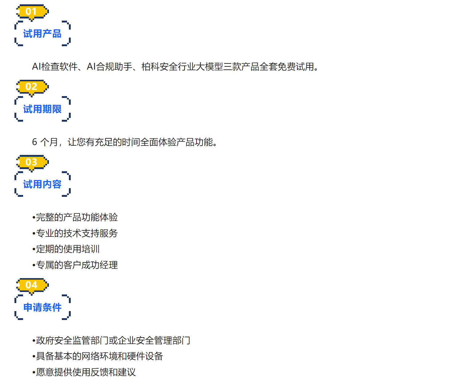 为了让更多的政府部门和企业能够体验AI赋能安全管理的革命性价值,上海柏科特别推出了长达半年的免费试用政策(即日起至2026年7月27日):